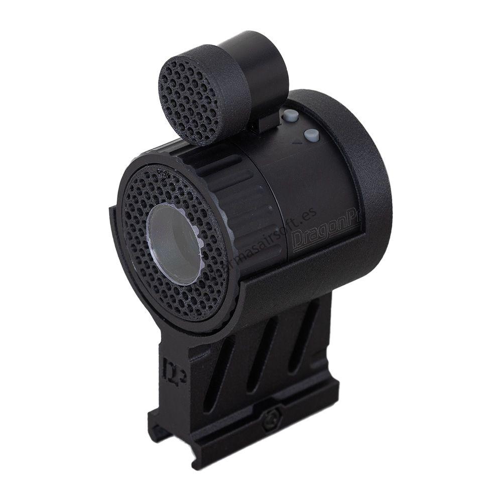 Fabricado con estructura metálica y carcasa exterior de polímero, el DP-VN10 es resistente y ligero, con solo 99 g (154 g con montura y protectores). Incluye una montura de polímero reforzado con fibra de carbono compatible con raíl Picatinny de 20 mm, así como protectores específicos para la luz IR y el sensor de imagen, diseñados para proteger ambos componentes frente a impactos de BBs o bolas de airsoft, incluyendo un protector de policarbonato transparente de 3 mm para el sensor. El paquete se completa con un maletín de transporte DragonPro IP55 de 31 cm, perfecto para transportar el equipo a partidas y eventos nocturnos. Su batería de 1200 mAh garantiza un uso prolongado durante toda la noche.