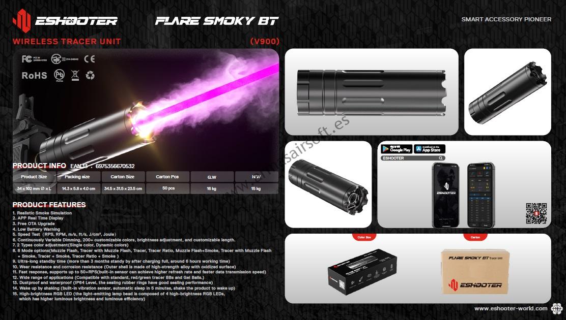 1. Realistic Smoke Simulation 2. APP Real Time Display 3. Free OTA Upgrade 4. Low Battery Warning 5. Speed Test(RPS, RPM, m/s, ft/s, J/cm², Joule) 6. Continuously Variable Dimming, 200+ customizable colors, brightness adjustment, and customizable length. 7. 2 Types color adjustment(Single color, Dynamic colors) 8. 8 Mode options(Muzzle Flash, Tracer with Muzzle Flash, Tracer, Tracer Ratio, Muzzle Flash+Smoke, Tracer with Muzzle Flash + Smoke, Tracer + Smoke, Tracer Ratio + Smoke ) 9. Ultra-long standby time (more than 3 months standy by after charging full, around 6 hours working time) 10. Wear resistance and corrosion resistance (Outer shell is made of high-strength alloy with oxidized surface) 11. Fast response, supports up to 50+RPS(built-in sensor can achieve higher refresh rate and faster data transmission speed) 12. Wide range of applications (Compatible with standard, red/green tracer BBs and Gel Balls.) 13. Dustproof and waterproof (IP64 Level, the sealing rubber rings have good sealing performance) 14. Wake up by shaking (built-in vibration sensor, automatic sleep in 5 minutes, shake the product to wake up) 15. High-brightness RGB LED (the light-emitting lamp bead is composed of 4 high-brightness RGB LEDs,