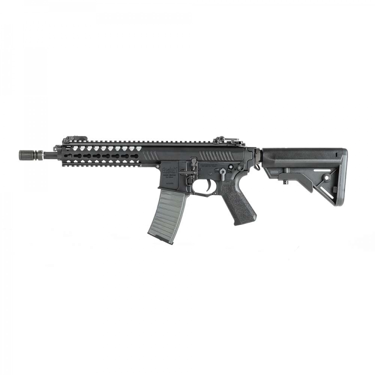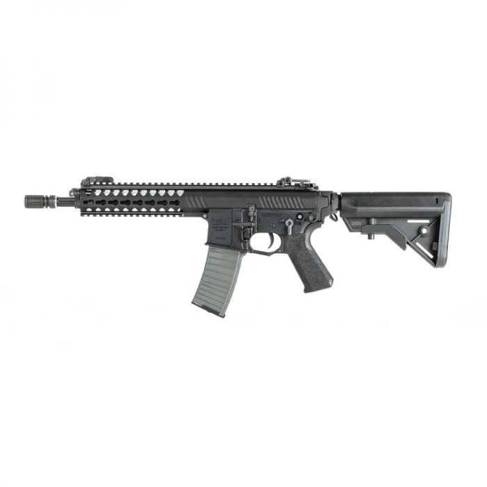 CARACTERÍSTICAS: – Largo: 699 / 780 mm – Canón interno: 285 mm – Peso: 2390 g – Capacidad. 120 tiros – Keymod – Ambidiestra – Mosfet – Seguro manual – Miras ajustables – Incluye maletín de transporte rígido.