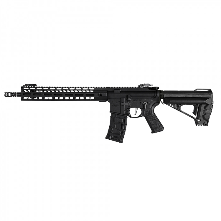 CARACTERÍSTICAS: – Largo: 828 / 910 mm – Canón interno: 380 mm – Peso: 3100 g – Capacidad. 120 tiros – Miras ajustables y abatibles – Keymod – Ambidiestra – Mosfet – Rodamientos de 8 mm – Incluye maletín de transporte rígido.