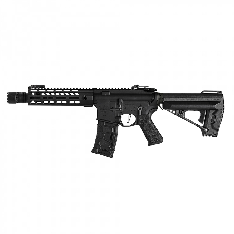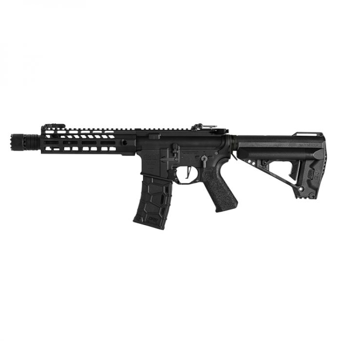 CARACTERÍSTICAS: – Largo: 662 / 745mm – Canón interno: 275 mm – Peso: 2700 g – Capacidad. 120 tiros – Miras ajustables y abatibles – Keymod – Ambidiestra – Mosfet – Rodamientos de 8 mm – Incluye maletín de transporte rígido.